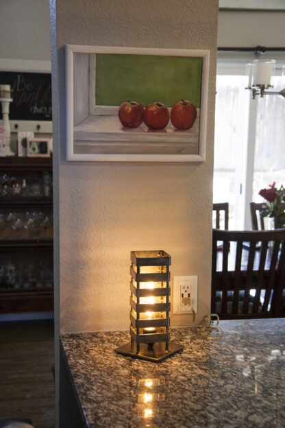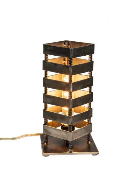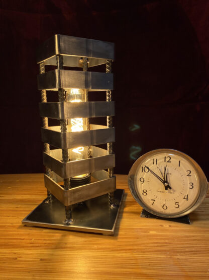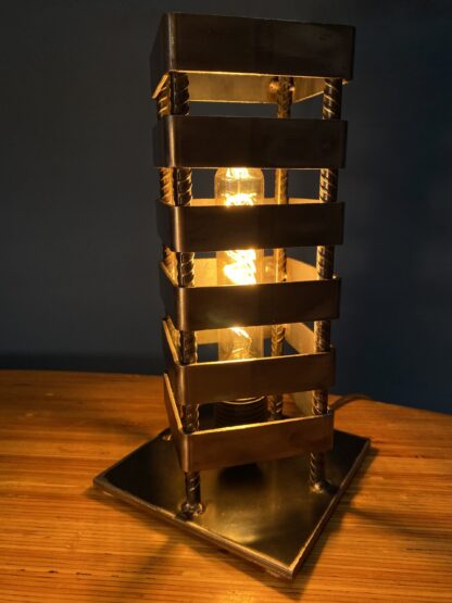 Light It Up Designs hand crafted Edison tower table lamp is going to be the one of a kind feature in your space. The versatility in style makes it easy to add that special touch in any room. This unique design projects a gorgeous shadow that can add dimension to all spaces. Made of four polished rebar bars, tig welded with four inch square tubing. This lamp stands 12′ tall, on a sturdy steel base, lined with felt padding.