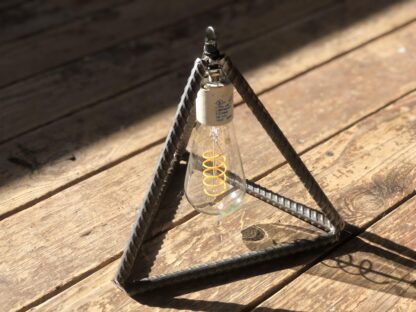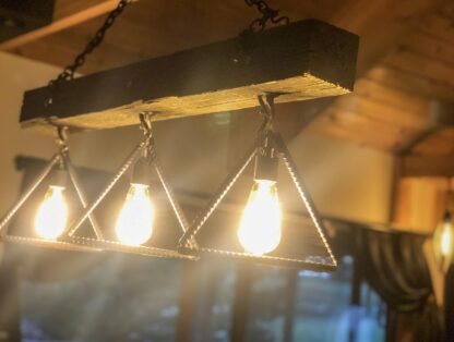 This is a custom one of a kind hand crafted chandelier. The light fixtures are welded rebar and they are attached using a nice ceiling hook with the cord ran on top and through the chain to be able to hook up to a power source in your home. This chandelier does include 3 Edison style bulbs and one power cable. Chain to hang this is also included. Dimensions of the beam: 4 x 4 x 37 1/2 inches Dimensions of the rebar lights: 8 x 8 x 8